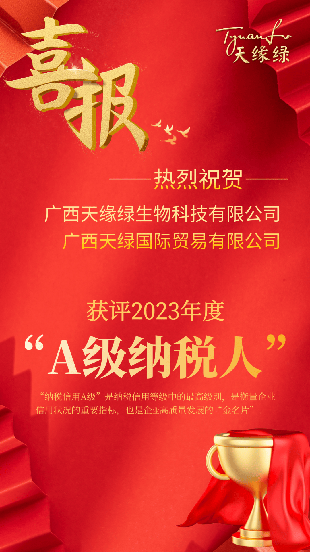 近日,國(guó)家稅務(wù)總局公布了2023年度納稅信用評(píng)價(jià)結(jié)果,天緣綠集團(tuán)母公司——廣西天緣綠生物科技有限公司及子公司——廣西天綠國(guó)際貿(mào)易有限公司憑借卓越的納稅信用表現(xiàn),雙雙獲評(píng)“2023年度納稅信用A級(jí)納稅人”。