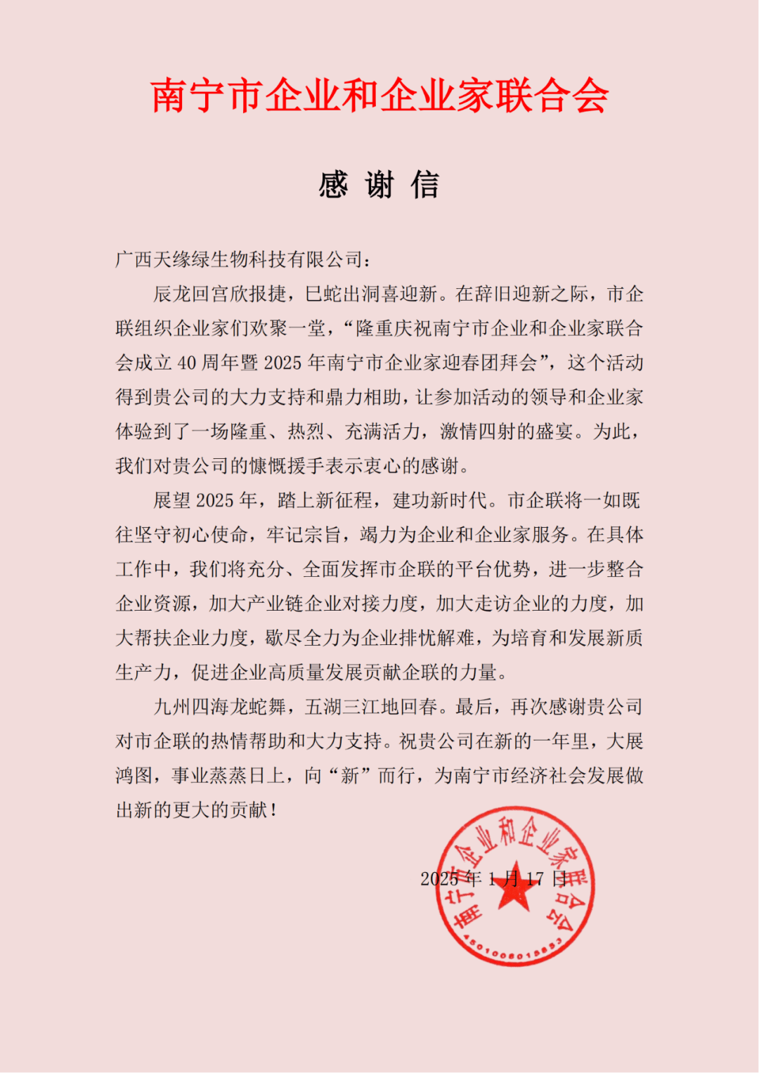 近日,廣西天緣綠科技集團(tuán)收到了南寧市企業(yè)和企業(yè)家聯(lián)合會(huì)(簡稱“南寧市企聯(lián)”)的深情感謝信,信中對天緣綠集團(tuán)在“南寧市企聯(lián)成立40周年暨2025年南寧市企業(yè)家迎春團(tuán)拜會(huì)”中的慷慨支持與鼎力相助表達(dá)了由衷的感激。此次活動(dòng)在天緣綠集團(tuán)的助力下,不僅取得了圓滿成功,更讓每一位參與其中的領(lǐng)導(dǎo)和企業(yè)家深切感受到了市企聯(lián)的熱情與蓬勃活力。